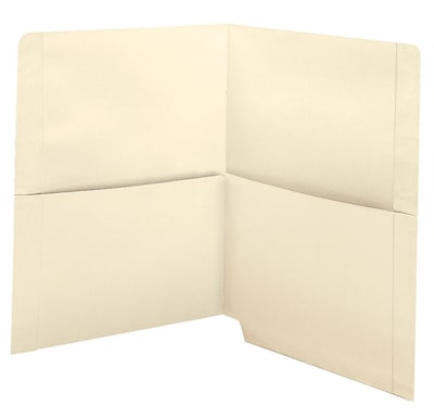 Half pockets on both sides of folder open to center and top. 11 pt. construction. Double-thick end tabs. Embossed score lines for labels. Flat, no expansion. 50 per box. Size: 12-1/4"W x 9-1/2"H overall, 11-3/4"W x 9"H front panel. Pockets are 5-3/4"D.