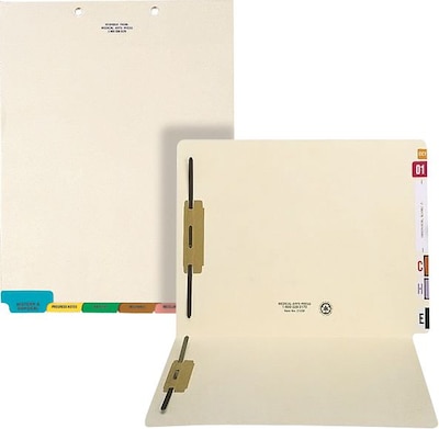 Features full height 7/8-in. wide end-tab! Heavy-weight 150 lb. manila stock. 11 pt. folders have 2-ply reinforced end-tab. Embossed score line on tab for easy label placement. Two preaffixed fasteners. Scored for 3/4 inch expansion. Recycled 10% post consumer content. 1 and 3 fasteners' positions.