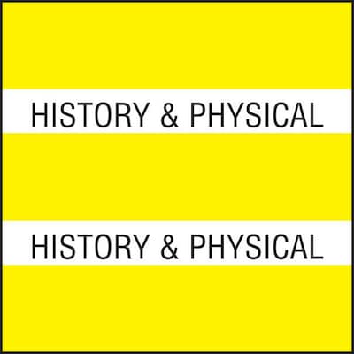 Double bands of Yellow and "History & Physical" title appear on both sides. Scored for easy application. Permanent adhesive backing with laminated mylar coating. Use with Dividers 20256 and 20257. 102 tab package. Size: 1-1/2" x 1-1/2" (before folding).