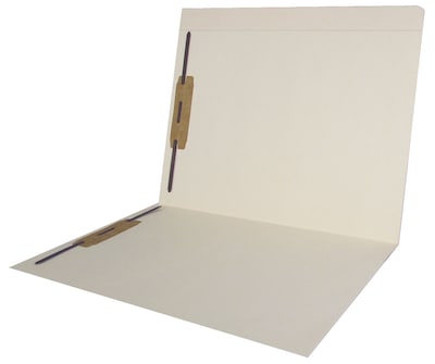 Sturdy 11 pt. manila folders have full cut double-thick top-tabs. Two 2 inch capacity preinstalled fasteners hold 2-hole punched paperwork. Scored for 3/4 inch expansion. Recycled 10% post consumer content.