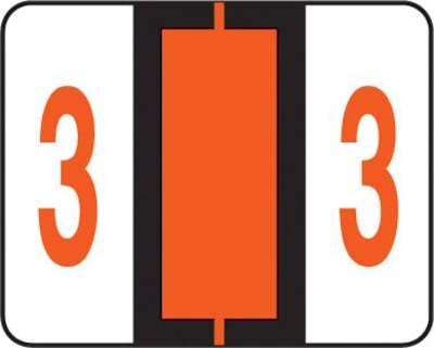 Compatible with TAB® Products labels - same design, same color - but you pay less! Labels are scored and self-adhesive with clear laminate finish. 500 Dark Orange "3" labels per roll in a self-dispensing box. Label size: 1-1/4"W x 1"H before folding.