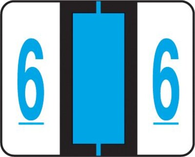 Compatible with TAB® Products labels - same design, same color - but you pay less! Labels are scored and self-adhesive with clear laminate finish. 500 Blue "6" labels per roll in a self-dispensing box. Label size: 1-1/4"W x 1"H before folding.