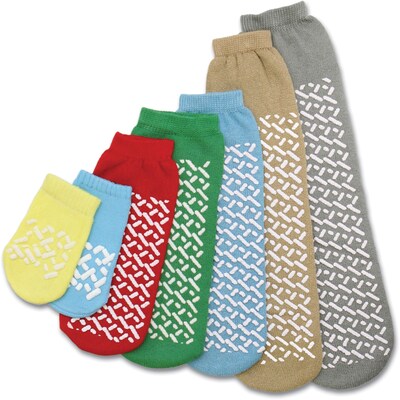 Single-tread slipper socks are constructed with terrycloth inside to absorb perspiration and provide added patient comfort. Slipper socks have attractive color-coded sizes for easy identification.
