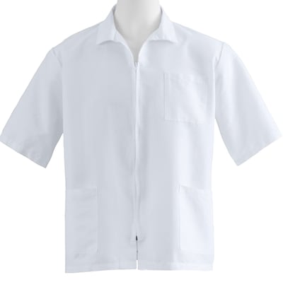 - White, unisex zip front smock for staff in laboratories and medical centers