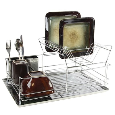 The Mega Chef 15 1/2" stainless iron shelf dish rack in chrome-plated finish, holds all your hand-washables. This dish rack measuring 8 3/4" x 12 3/4" x 15 1/2", has two tier design. It features iron wire construction. This dish rack simplifies the task of drying your dishes. It accommodates utensils, plates, bowls and cups for maximal dish drying. It comes along with one stainless draining tray and one stainless utensil holder.