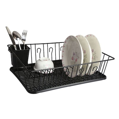 The Mega Chef 17 1/2" dish rack in black, holds all your hand-washables. This dish rack featuring iron wire construction, simplifies the task of drying your dishes. It features a utensil holder, plastic cup, plastic draining tray, slots for plates and space for cups as well as bowls.