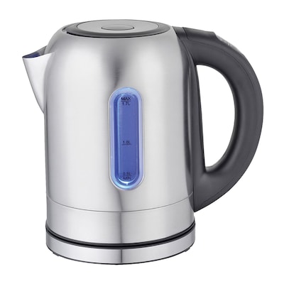 The Mega Chef 1.7 ltr black/silver electric tea kettle with five preset temperature, features stainless steel construction for added durability. It has boil-dry protection and is BPA free. The 360-deg cordless jug-kettle with drip-free spout, features concealed stainless steel heating element and LED lights that illuminate to different colors for each of the different temperature settings. It offers 2-button operation and cord-free serving.