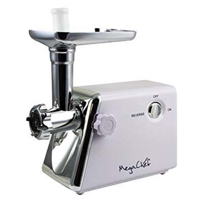The Mega Chef 93596263M 1200 W ultra powerful automatic meat grinder in white/silver color, is suitable for processing, yielding, chopping, tenderizing, grinding any types of meats, nuts and vegetables. Grinder measuring 9.55" x 7.55" x 7.55", features forward/reverse motor, keyboard switch and cord storage back panel. Featuring three different grinding blades, this grinder makes for the essential kitchen appliance. It comes with three grinding blades, one cutting glade, one kibbe attachment, one food pusher, hopper plate and sausage attachment.