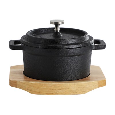 Treat yourself to dessert for one or serve your favorite apps with class in this MegaChef Mini Cast Iron 8oz dutch oven and tray. The mini size of this cast iron is perfect for baking single portions, and serving on the wooden tray straight from the oven. This two piece set is ideal for both a night in for one, and to entertain in style. Designed for exceptional heat retention and even cooking, this mini dutch oven ensures your meals are seared and cooked to perfection. Suitable for stovetop, oven, and even outdoor grilling, this mini pan is perfect for all your culinary adventures.The natural wood tray adds a touch of rustic elegance, making it convenient to serve directly from the oven. It also protects surfaces from heat while enhancing your kitchen aesthetic. This MegaChef Mini Cast Iron 8ox dutch oven and tray is a must-have for anyone who appreciated fine cooking and beautiful presentation!