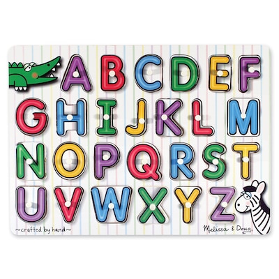 Melissa & Doug® See-inside alphabet peg puzzle is made of wood for durability and is ideal for a age group of 3+ yrs.
