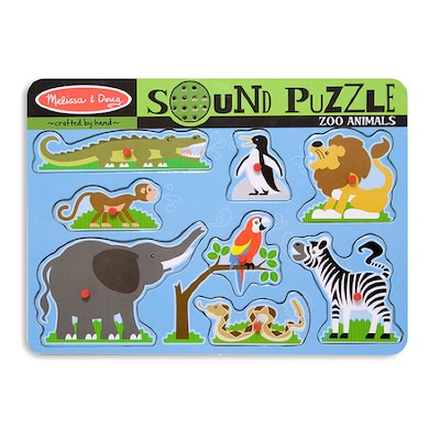 Melissa & Doug® "Zoo Animals" Sound puzzle is made of wood and measures 8 3/4" x 11 3/4" x 1". Puzzle with color matching picture enhances matching and listening skills in children.