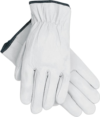 Industrial and warehouse work gloves for many applications. Memphis Gloves® X-Large driver's gloves in white color are made of premium grade goatskin leather for enhanced durability. Gloves with slip-on cuff feature shirred elastic back, color-coded hem and are ideal for industrial work.