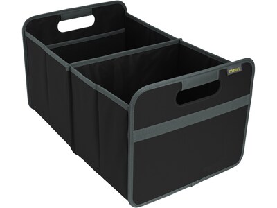 The meori Large foldable fabric box is a great size for organizing the office, trunk, carrying groceries, or going on road trips. It holds up to 65 lbs. and folds and unfolds in three quick steps. Collapsible and folds flat when not in use. This box features two compartments and two interior mesh pockets. Wipes clean easily with a damp sponge.