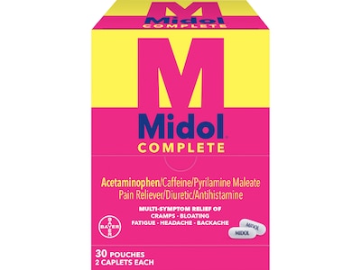 You feel it coming on. But this time you're not worried. Pick up your Midol Complete and be on your way to relief from period symptoms, including cramps, bloating, fatigue, water weight gain, backache, muscle ache, and headaches.
