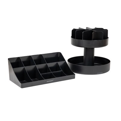 Transform your coffee breaks with this 2-piece set - a spacious 2-tiered, 11-compartment cup and condiment organizer, and a 2-tier snack carousel, designed to make finding the right choices a breeze. Say goodbye to rifled-through and unusable cups, condiments and snacks. This set neatly displays items for easy access and caters to diverse preferences. Ideal for hotel lobbies, breakrooms, hospitality suites, restaurants, and office reception areas, this organizer set is perfect for various settings.Beyond coffee cups, condiments and snacks, these organizers can be used creatively on countertops or inside cabinets to store office supplies, art materials, and more. The varying compartment sizes make it a helpful tool for organizing pens, rubber bands, paintbrushes, and other items.Maintenance is effortless with these organizers. Wipe surfaces with a damp cloth for easy cleanup or rinse under warm water for stubborn messes. Constructed from durable, food-safe plastic, the organizers are ready to use straight out of the box. Rubber grips on the bottom surface ensure stability on countertops and cabinets.Lightweight and durable, these compact organizers are ideal for creating a complete beverage and snack station for office breakrooms, parties, and hospitality suites. It also makes a thoughtful gift for anyone looking to enhance their coffee break experience and keep their beverage and snack area tidy and organized.
