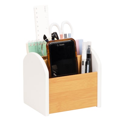 Upgrade your workspace with this compact desktop organizer featuring natural wood compartments and matte-finish side panels in your choice of black or white.
