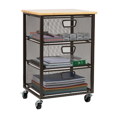Streamline your workspace with this sleek and practical rolling storage cart. Designed with a sturdy metal mesh frame and three easy-glide drawers, it’s ideal for organizing files, office supplies, notebooks, or personal items in a home office or professional setting. A smooth wood top adds both style and function—perfect for sorting paperwork, placing a printer, or displaying décor.