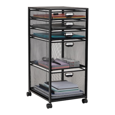 This lightweight, multipurpose rolling cart is the perfect solution for keeping your workspace or home office organized. Featuring five removable mesh drawers, it provides ample space for everything from office supplies and paperwork to craft tools, cables, and accessories. Each drawer includes a built-in label bracket and white card to help keep your items categorized and easy to locate.