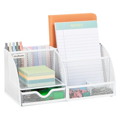 Declutter your desk and boost productivity with the Mind Reader 7-Compartment Desktop Organizer. Designed with a durable white metal mesh frame, this all-in-one organizer features compartments for pens, paper clips, mail, sticky notes, and more. The sleek, minimalist design blends seamlessly into any office or home decor while providing versatile storage for your most-used accessories. Perfect for desktops, this compact organizer measures 11"L x 5.5"W x 5.25"H and includes a mail sorter, pen cup, drawer, and trays for quick access to essentials. Whether you're managing your home office, classroom, or work desk, this space-saving solution helps you stay organized and efficient throughout the day.