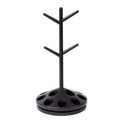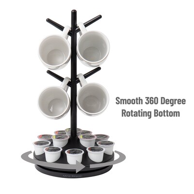 Simplify your morning coffee routine with this single-serve coffee pod carousel and mug tree, perfect for those who want a hassle-free start to their day. This versatile organizer lets you see all your coffee options at a glance while grabbing a mug from one of the tree branches.The base of the tree organizer stores up to 12 single-serve pods, while the tree branches hold up to 4 handled coffee mugs. The sturdy base ensures the organizer won't topple over when you remove a mug. The carousel feature allows you to easily spin the base and access your pod options.Constructed from durable black plastic, this organizer is designed for frequent use. It's an ideal addition to coffee bars and stations in hotels or breakrooms, and it fits perfectly on a countertop in a home kitchen or office. Measuring 9 inches long by 9 inches wide and 17.75 inches tall, it offers a compact solution for your coffee needs.This 4-mug organizer and pod carousel make a thoughtful gift for coffee or tea lovers, new students, first-time homeowners, or anyone who appreciates staying organized.