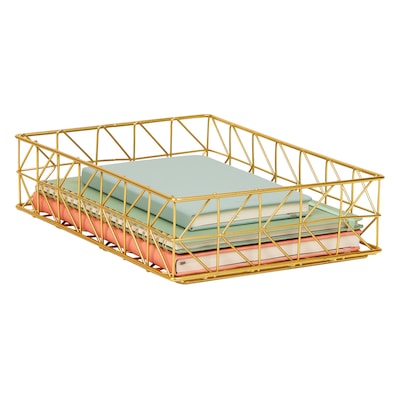 Elevate your workspace with the Mind Reader Gold Geometric Desktop Organizer, a sleek and functional solution for stylish organization. Featuring a contemporary geometric design, this sturdy metal paper tray keeps documents, folders, and office supplies neatly arranged while adding a modern touch to your decor. Lightweight yet durable, it offers deep capacity for papers, notebooks, and bills without taking up excess space. Ideal for home offices, student desks, or professional workspaces, this organizer pairs perfectly with other Mind Reader geometric accessories for a cohesive, sophisticated look. Stay productive and organized with a practical piece that blends glamour and function.