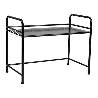 Maximize your kitchen counter space with this versatile and functional microwave oven rack. Designed to fit above any countertop microwave up to 13 inches tall and 22 inches wide, this rack offers a convenient storage solution for all your breakfast nook essentials. Alternatively, you can place your microwave on top of the shelf and tuck your coffee pot and breakfast ware beneath it.The mesh shelf top allows for ventilation for the microwave and provides a spot for you to keep your cookbooks, towels, potholders, and more. Two hooks are included to store your oven mitts, trivets, or utensils, and you can add more hooks if needed.Constructed from sturdy carbon steel with non-slip rubber feet, this rack is built to last and will keep your kitchen organized for years to come. It can be used as a pantry riser, on a breakfast bar, or any countertop, and is easily cleaned with a damp cloth.This microwave oven rack is the perfect addition to any kitchen and makes for a thoughtful gift for college students, new apartment owners, or anyone looking to streamline their kitchen space. Check out other items in the Elevate Collection to complete the look of your kitchen.