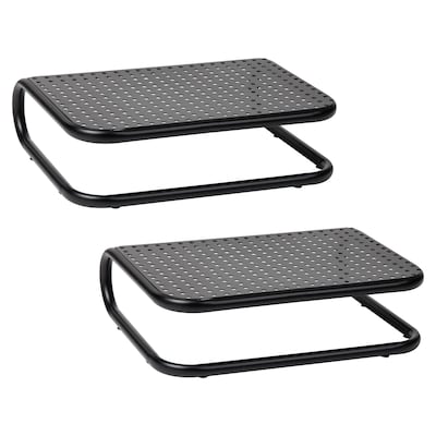 Elevate your workspace and improve your posture with this set of two black metal monitor stands. These stands can support up to 40 lbs of weight, making them ideal for dual-screen workstations, gaming desktops, or large monitors. The open-grid design allows for proper ventilation, preventing your devices from overheating.In addition to improving your posture, these monitor stands also help organize your workspace by allowing you to manage your cords easily and tuck them behind or beneath the riser. You can even store pads, books, or tablets beneath the stands.Constructed with durable metal and featuring rubber feet on the bottom, these monitor stands are built to withstand daily use. The sleek black design complements any decor style, making it a great addition to both home and office settings.Whether you're a first-time student, a work-from-home employee, or someone who needs an elevated monitor, this set of monitor stands from the Elevate Collection is a thoughtful and practical gift that will improve your workspace and your posture.