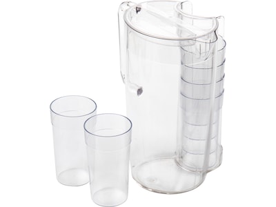 Experience convenience and transparency with this 100% AS plastic pitcher and 6-cup set. The clear design allows you to gauge your 10-oz. cup's content, eliminating guesswork before your next refill. Cups neatly stack within each other, fitting snugly inside the pitcher's channel until you're ready to serve. They remain securely in place, even while pouring from the pitcher.The pitcher features a lid to keep beverages contained and insects out. It's compact for easy storage in your cupboard or pantry, designed for daily use, and can be hand-washed with mild soap and warm water.With an 88-oz capacity, the pitcher accommodates cold beverages and ice. Weighing 1.5 lbs (680 g), it's easy to handle, supported by a convenient handle for pouring. Cups measure 2.75" across x 5" tall, and the pitcher measures 6.5" across x 10.5" tall.Part of our Foundation line, this set is a thoughtful gift for frequent hosts, families, or anyone who enjoys beverages from a pitcher.