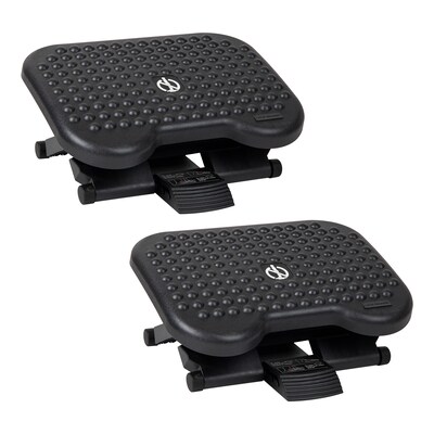 Double your comfort with this Mind Reader Adjustable Ergonomic Footrest Set of 2, designed to enhance posture, reduce leg and back strain, and promote healthy circulation while you sit. Each footrest features a tilting, height-adjustable platform with a textured massage surface that stimulates your feet and prevents slipping. Whether you're outfitting a dual workspace, sharing with a family member, or keeping one at home and one at the office, this two-pack ensures ergonomic support wherever you need it. Lightweight yet durable, these footrests make extended sitting more comfortable and productive.