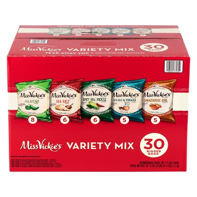 - A 30-Count case of deliciously flavored Miss Vickie's Kettle Cooked Chip bags in a variety of 4 flavors