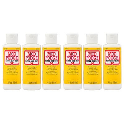 Mod Podge Matte is quick-drying and dries clear, leaving a smooth, matte finish. Preserve the beauty of your decoupage paper projects and more with this multi-purpose, all-in-one sealant, glue, and finish. Use this decoupage glue to create decoupage tissue paper projects as well as projects using wood, fabric, plastic, and canvas! This handy decoupage glue comes in a variety of finishes such as gloss, matte, glitter, satin, outdoor, dishwasher safe, and many other unique formulas for every project. Let your creativity come alive with the limitless possibilities of Mod Podge Matte. Sold as a pack of six 4 oz. bottles.