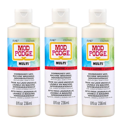 Mod Podge Multi dries clear, leaving a smooth, gloss finish. Preserve the beauty of your outdoor decoupage projects and more with this all-in-one glue, sealer, and finish. Preserve the beauty of your decoupage projects and more with this Gloss multi-purpose, all-in-one sealant, glue, and finish. Use this decoupage glue to create decoupage projects on wood, fabric, plastic, and canvas! Let your creativity come alive with the limitless possibilities of Mod Podge Multi Gloss. Sold as a pack of 3 bottles.