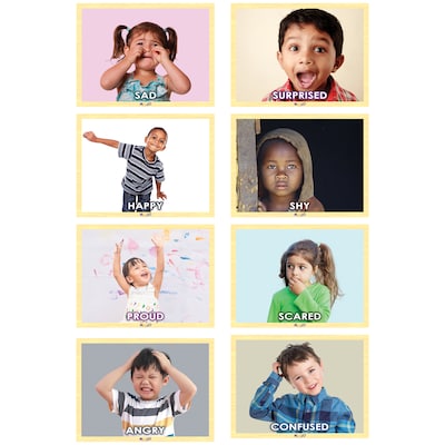 This set of eight wooden puzzles aids social-emotional learning by featuring a wide range of facial expressions and body language of children expressing different emotions. Encourage children to demonstrate their own expressions (happy, sad, frightened...) with their classmates. Ages 3-5, 8 puzzles of 7-12 pieces each. 9" x 11" finished size of each puzzle.