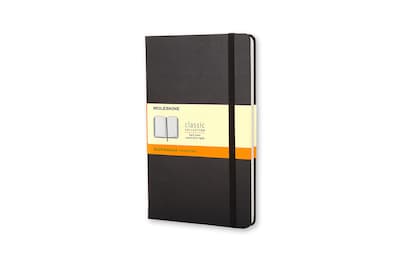 Carry this black cardboard classic notebook in a pocket or bag for easy access to notes. The cardboard cover of this notebook protects pages from folding, wrinkling and other damage, while the rounded corners prevent cuts and snagging. This Moleskine classic notebook has a built-in pocket for holding small accessories or notes, while the elastic closure lets you seal it tightly shut.