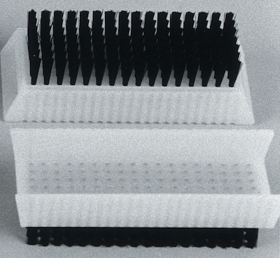 - Hard textured nylon bristles in an open-ended channel back block
