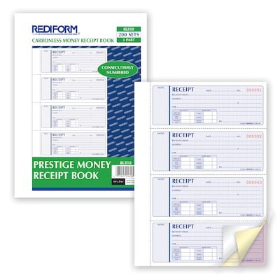 Rediform® Hardbound Money Receipt Book, Carbonless, Numbered, Hard Cover, 4 Per Page, 10 3/4" x 7 5/8", 200 Triplicate Sets (8L818)