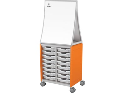 MooreCo Hierarchy Compass Midi H2 is a customizable storage solution that integrates with accessories that promote an active learning environment. Side panels are 18-gauge powder-coated steel reinforced with two 20-gauge 0.98" square steel tubes and two rows of 14 peg holes. Top panel, rear panel, and bottom panel are all 18-gauge platinum powder-coated steel. Four 3.94" casters are constructed from a reinforced plastic body with non-marking gray polyurethane wheels. Two casters are locking. Casters have a 0.5" x 1" stem. MooreCo Hierarchy Compass Midi H2 uses Gratnell's trays and the stop-safe runner system to allow for customization within the cabinet. Runners clip into the side panels and upright assemblies in a virtually unlimited amount of configurations. Ogee whiteboard is mounted at the cabinet's top.