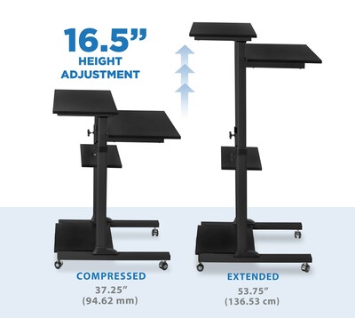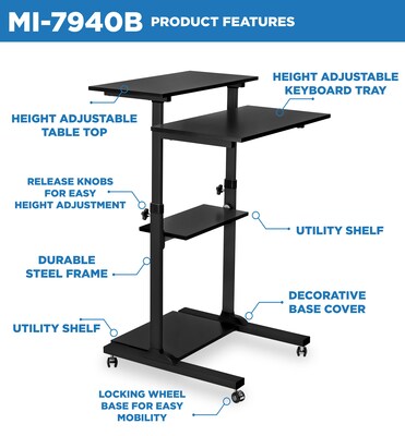 This sturdy, mobile standing desk is great for use as a mobile computer/laptop station in the office, in hospitals, showrooms, classrooms, and more. Carefully designed platforms provide ample space for monitors, keyboards, mouse pads, PC towers and printers. Use with or without a monitor stand for an ergonomic setup. Easy-roll casters move in every direction, allowing convenient relocation from room to room. The locking casters support mobility and stability, when needed. All necessary hardware and installation instructions are provided for assembly.