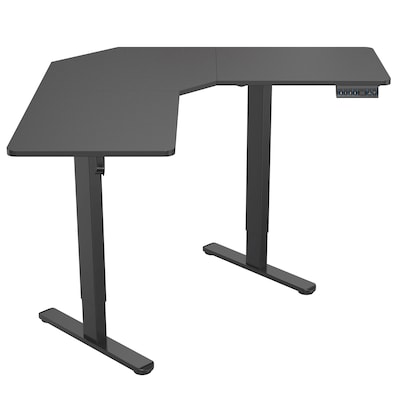 Add movement to your working day without compromising on valuable desk space with this electric adjustable desk that is ideal for corners. Switch between sitting and standing at the simple push of a button. The advanced LED control panel comes with three memory settings for your preferred sitting and standing heights. The integrated anti-collision function of this corner automatic height adjustable desk ensures that your desk does not bump into objects such as filing cabinets when it is lowered. To help you stay organized, the corner desk features two hooks for bags or headphones and cable management for neat cable routing. Dual motors ensure smooth and quiet height adjustment between 28.3 and 47.2 inches. Even in small spaces you can make perfect use of available space with this corner desk. Set-up your workspace in a corner of your room at home or combine with additional back-to-back desks to create team areas in open-plan office environments. No matter where you work, choose this adjustable ergonomic standing desk and add movement to your workday! Color frame: black. Color tabletop: black.