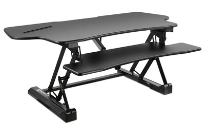This Mount-It! desk converter works out of the box on top of your existing desk. The powerful electric motor adjusts the height from 6" all the way up to 19.25." A spacious tabletop measures 48.5," and the keyboard tray measures 35.5", so you can use keyboard and mouse side-by-side, two monitors, laptop, tablet, and more. Increase your efficiency by adding a dual monitor mount to this desk to free up even more space.