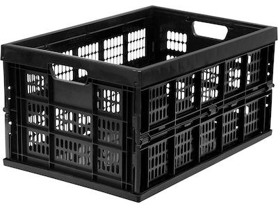 This collapsible and stackable storage crate can carry up to 51.78 qt., making it easier to stay organized. It can fold down to 2.13" for easy portability and storage when not in use. This Mount-It! storage crate is designed with the ability to stack multiple crates on top of one another. The grated wall design, constructed with heavy-duty plastic, allows you to easily see the contents inside. It features heavy-duty side handles for an easier way to carry the load.