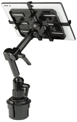 This universal tablet car cupholder mount allows you or your passenger to safely display or interact with a tablet while driving. The heavy-duty carbon fiber arm securely holds your iPad or tablet while your car, truck, or van is on a road. Easy locking knobs at each joint ensures a strong and stable grip so your tablet won't drift, sway, or sag even on the bumpiest drives. This vehicle mount is easily installed and removed from a car's front seat or center console - no special tools necessary. All necessary instructions and hardware included.