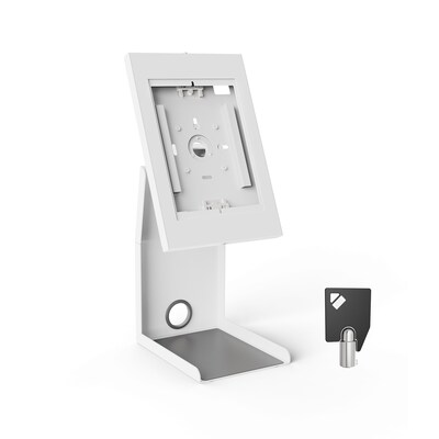 This tablet stand combines functionality and security, making it an ideal solution for retail stores, cafés, and other busy public spaces. Designed with a tamper-proof, lockable enclosure, it provides peace of mind in high-traffic environments. Its compatibility with a wide range of iPad models ensures versatility, while the integrated shelf conveniently holds small printers to streamline operations and optimize counter space. The tiltable design allows seamless interaction, enabling cashiers and customers to easily share the screen for smoother transactions. Whether freestanding or securely mounted to a countertop, the stand delivers reliable stability and adaptability. The 90° rotating enclosure offers effortless switching between portrait and landscape orientations, and its robust steel construction is built to withstand the demands of daily use in commercial settings. Choose between black and white finishes to match your décor.