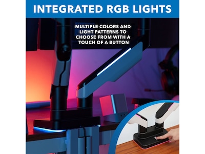 Create your perfect immersive gaming station or a professional multiscreen desk setup with this Mount-It! desk mount for monitors with screen size up to 35" and weight up to 44 lbs. The mount's optimized heavy-duty tilting and gas spring mechanisms allow for smooth and stable adjustment of large screens. The full-motion design enables you to lower and raise, swivel, tilt, and rotate your screens to achieve the perfect viewing height and angle. To fully immerse in your game, this mount features RGB lighting along the arms and on the base: simply switch between 20 different modes by pressing the easily accessible RGB mode button on the base. Both, a clamp and grommet mount are included for easy installation on your desk. The detachable VESA plate with 75 x 75 and 100 x 100 hole patterns allows for quick installation of your monitors, and the integrated cable management ensures neat and organized cable routing along the arms.