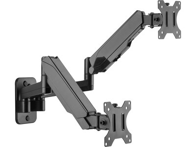 Easily raise your monitor to an optimal viewing height, reducing the strain on your neck and shoulder while working with Mount-It! MI-1766B dual-monitor wall mount. Each arm comes with a gas-spring mechanism for easy height adjustment without the need for tools. Full-motion articulating arms are fully adjustable for placing the monitor to almost any viewing angle. Comes with necessary hardware for an easy mounting process including mounting screws, anchors, washers, and VESA screws. Integrated cable management channels in each arm keep AV and power cords organized. Both monitors can be placed in landscape or portrait position. The articulating arms reach a max extension of 16.6" from the wall.