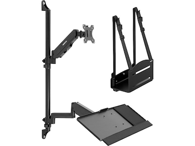 This Mount-It! wall-mount workstation is designed for commercial and industrial use. It houses one monitor, keyboard, and mouse tray, as well as a desktop computer CPU in a compact and ergonomic package. The gas-spring monitor and keyboard tray arms offer full motion and height adjustment. It is perfect for applications where more than one user needs access to the computer system. The wall-mounted design takes up minimal space and can be adjusted for the needs of multiple users.