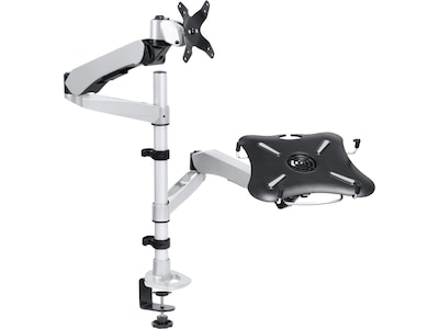 Create a more ergonomic environment by adding this monitor and laptop mount into your office space. The Mount-It! full-motion swiveling arm mount significantly increases the functionality of your devices and displays. Having two screens available will help increase productivity since you won't need to switch back and forth between applications. The laptop mount features a cooling fan that will prevent the laptop from overheating. The laptop mount supports screens up to 15", and the monitor mount fits screens from 13" to 27". Cluttered desks, eye straining, back and neck pain, sun glare, and overheating will be a distant memory thanks to this mounting stand.