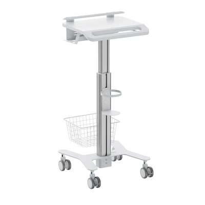 - This is a height adjustable mobile medical laptop cart with pneumatic adjustment, finished in white and grey to complement clinical and healthcare environments.