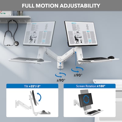 Introducing our innovative, space-saving, wall-mounted solution, designed specifically for doctor's offices, examination rooms, dental clinics, and more. Featuring a spring arm design, it allows for instant height adjustments, ensuring maximum convenience and user comfort. The flexible monitor adjustment along the arm caters to various user needs, while the folding keyboard tray saves valuable space when not in use. An integrated mousepad that slides out on either the left or right side accommodates all users. Additionally, built-in features such as convenient scanner access and cable management keep your workspace organized and safe.