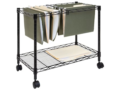 - ROLLING FILE CART WITH STORAGE: Second shelf at the bottom can hold office supplies, books, manuals and reams of paper. Hanging file office cart measures 23.25 inch Long x 13.5 inch Wide and 20 inches High.